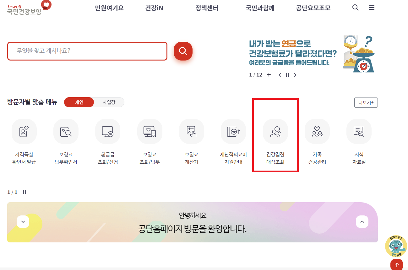 1.들어가신 후 건강검진 대상 조회로 들어가주세요.
